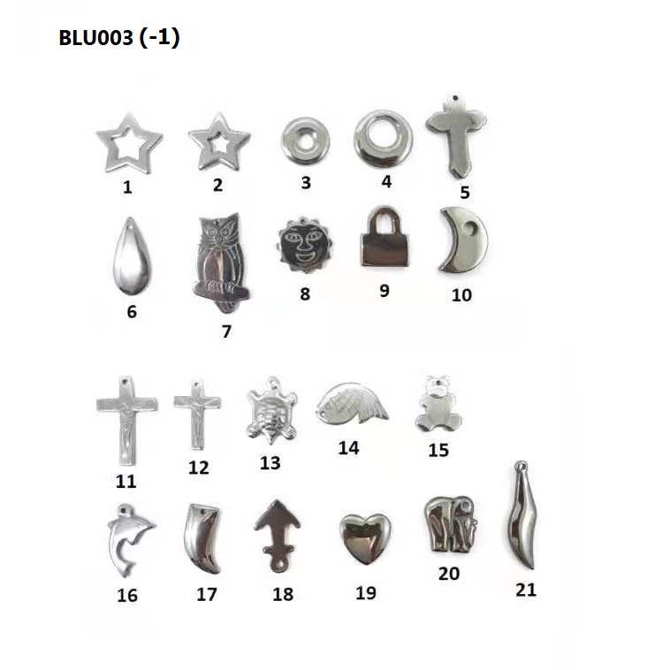 - Bintang - Salib Kecil UK 3,7x2,7 cm - Bintang Kecil - Salib besar UK 4,5x3,2 cm - Bulan - Kura kura - Matahari - Ikan - Bulat Lubang Tengah - Dolphin - Bulat Tengah Kecil - Taring - Burung Hantu - Pedang - Gembok - Gajah - Salib Gerigi - Jangkar - Tetes - Love titik