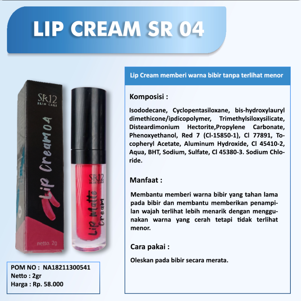 Sr12 exclusive lip cream Dapat mempercantik bibir dengan hasil warna yang lebih pekat dalam satu olesan, menghasilkan warna akhir yg matte tetapi tetap nyaman saat di gunakan dan mudah sekali saat diaplikasikan.
