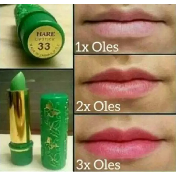 LIPSTICK HARE HIJAU Bagi para jamaah yang baru pulang dari Mekkah dan Madinah baik itu untuk menunaikan Ibadah Haji ataupun Umroh tentunya sudah tidak asing lagi dengan oleh-oleh lipstick merk Hare. Karena banyak di jual di sekitar mesjid Al Haramain Mekkah dan Madinah. Lipstik tersebut sering juga disebut lipstick ajaib karena apabila membuka lipstick dalamnya berwarna hijau, namun apabila dioleskan ke bibir maka warna yang dihasilkan dibibir berwarna pink,dan akan membuat bibir tampak merah alami dan warna tersebut tidak mudah hilang sehingga akan memberikan sentuhan akhir yang menawan di bibir si pemakai dan aman di bibir.