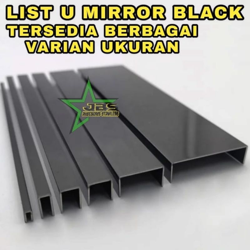 LIST U VARIASI / DEKORASI INTERIROR UNTUK KACA/CERMIN/ALKRILIK DAN LAIN LAIN.. UKURAN : 20mm x 40mm x20mm/2CMX4CMX2CM PANJANG : 3.050mm/305CM KETEBALAN = 0.8mm FINISHING : BLACK MIRROR BAHAN STAINLESS STEEL 201 TIDAK NEMPEL MAGNET.