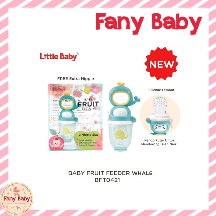 Baby Fruit fedeer adalah fedeer yang juga berfungsi untuk membantu anak mencoba berbagai jenis makan tanpa takut tersedak . Nipple dapat diisi dengan makanan buah - buahan maupun makanan lain seperti ayam , ikan , dan sayuran . Ujung nipple didesain khusus agar makanan yang keluar sesuai dengan kapasitas mulut anak .