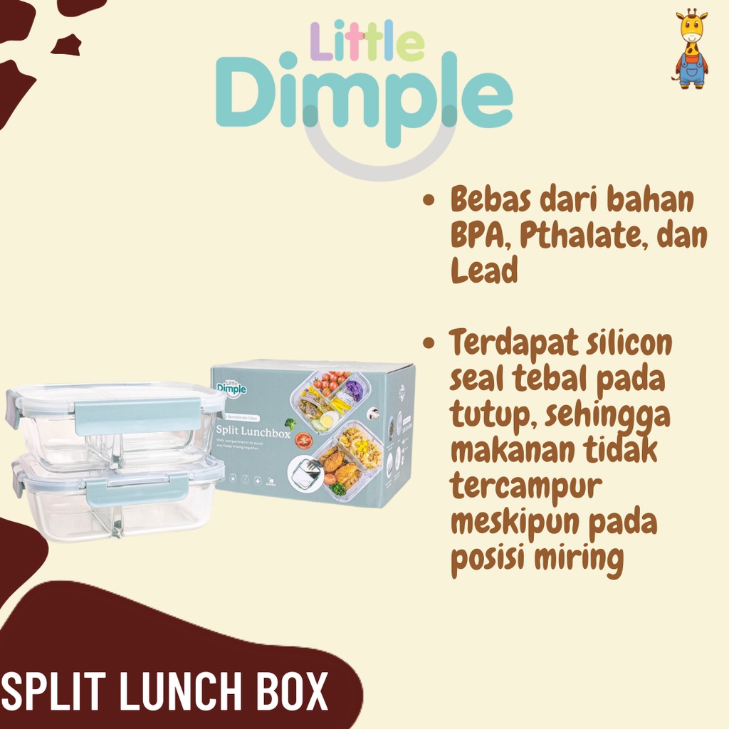 Little Dimple Split Lunchbox merupakan solusi wadah bekal tanpa takut tumpah atau bercampur menu satu dan lainnya. •Bebas dari bahan BPA, Pthalate, dan Lead • Bahan High Borosilicate Glass, tahan suhu -20’C s.d 520’C • Terdapat silicon seal tebal pada tutup, sehingga makanan tidak tercampur meskipun pada posisi miring. • Higienis, silicon seal dapat dilepas untuk memudahkan pencucian • Bahan borosilicate glass tidak meninggalkan noda dan bau bekas makanan • Freezer, microwave, dishwasher, and oven safe
