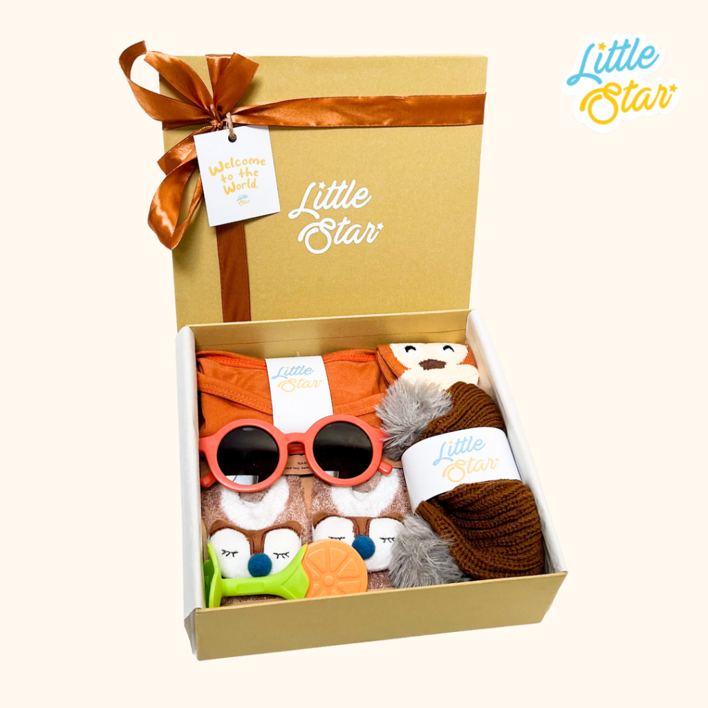 -Pilihan packaging a. Premium Hardbox: Box hardbox hampers tebal premium berwarna dengan pita. b. Box+Kertas Kado: Box hampers dengan dibungkus kertas kado + pita (Motif dan warna random acak, namun tim Little Star akan bantu kirimkan tetap senada). c. Box Biasa: Box hampers dengan pita.