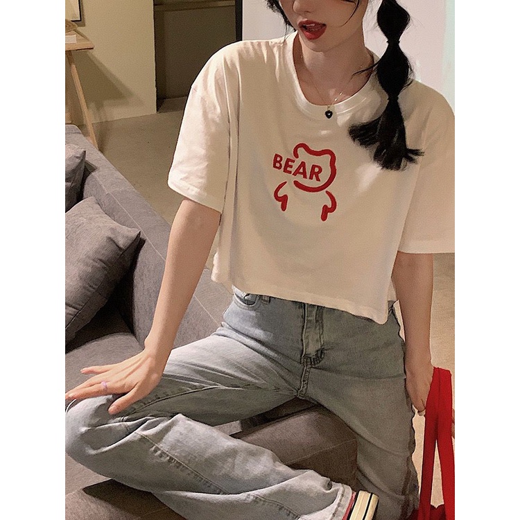 Pakaian Wanita > Atasan > Kaus > [littlecrab] Crop Top Lebar Bear Hitam Putih Merah Atasan Polos Sablon Berkualitas Beruang Simple Unik Elegan Aesthetic Kaos Beruang Korean Style
