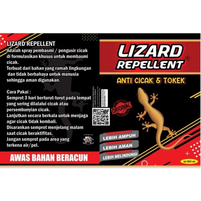 LIZARD REPELLENT 250ML merupakan cara praktis membasmi/mengusir cicak dan tokek. Fungsi utamanya adalah mengusir bukan membunuh .akan tetapi produk ini juga mengadung racun sehingga jika di semprotkan ke target cicak dan tokek juga bisa mati. Produk ini bisa di gunakan di tempat-tempat seperti: - Cicak di dinding rumah - Cicak di gudang - Cicak di peternakan sarang walet - d.s.b