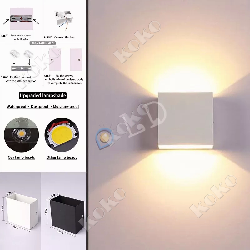 Spesifikasi: Warna hitam Tegangan: AC 85-265V Watt: 5W(Atas)+5W(Bawah)=10W Model: IP65 (Tahan Air) Sumber cahaya: COB LED Warna Cahaya: Putih Hangat (3000k) Aplikasi: Luar Ruangan/Dalam Ruangan Bahan: Paduan Aluminium Ukuran: 100mm x 100mm x 100mm