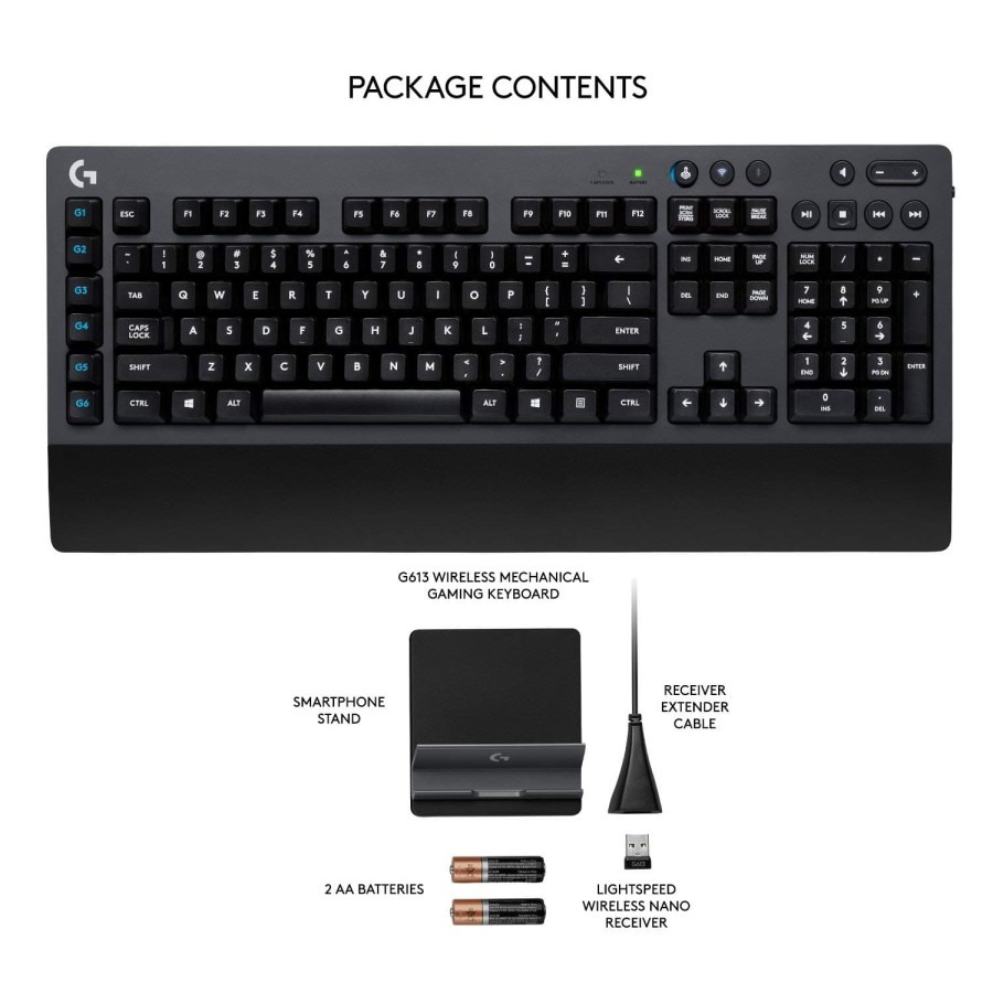 ISI KEMASAN G613 wireless mechanical keyboard Receiver USB LIGHTSPEED Dudukan telepon Kabel USB perpanjangan 2 Baterai AA Dokumentasi pengguna