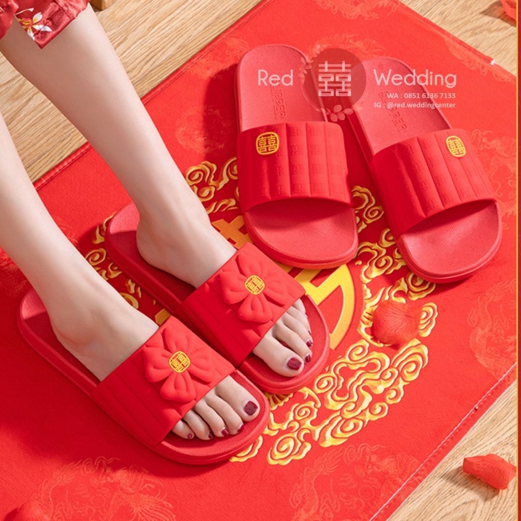 Detail [Logo Small Xi] Sandal Merah Bahan KARET Pengatin Groom /Bride Sepatu Wedding dengan Logo Shuang Xi Sanghi
