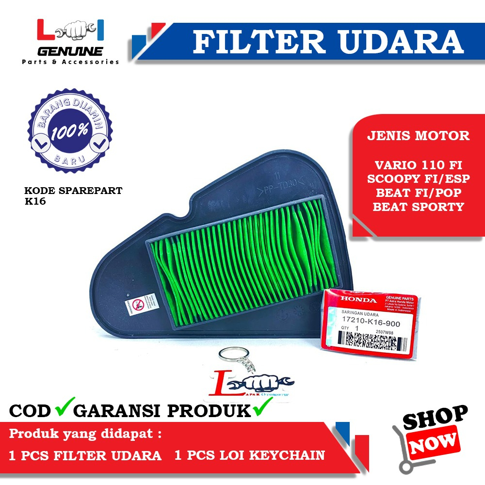 -LOI- FILTER UDARA SARINGAN UDARA BEAT FI, GENIO, BEAT ESP, BEAT STREET OLD/NEW, SCOOPY FI, SCOOPY ESP, VARIO 110 FI/ESP Isi Produk : FILTER UDARA Kode Sparepart : K16/KZL & K0J