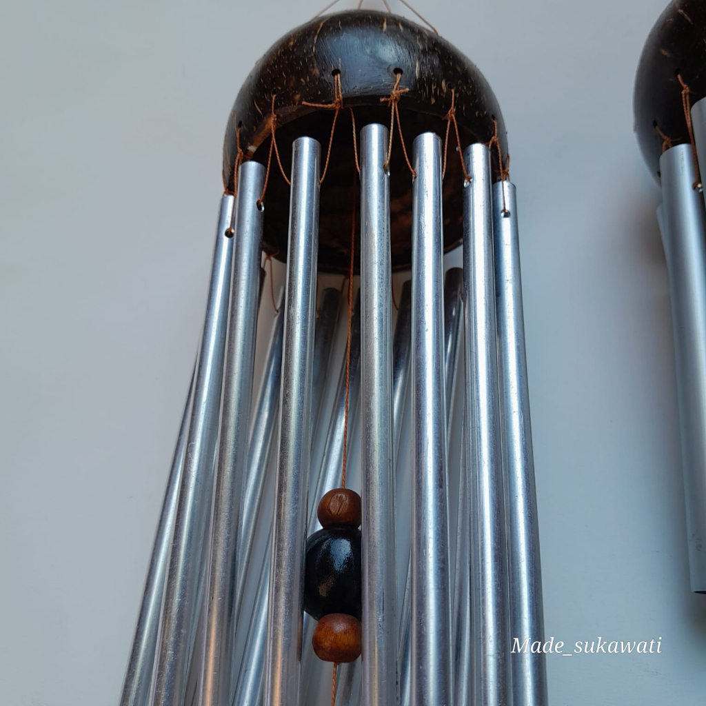 Produk kerajinan tangan lonceng bel wind chime krincingan aluminium dengan hiasan kepala Batok, , lonceng krincingan klasik tradisional bahan atas batok kepala dengan gantungan krincingan pipa aluminium, Beda size M dan L yaitu pada diameter Batok dan diameter pipa aluminium,