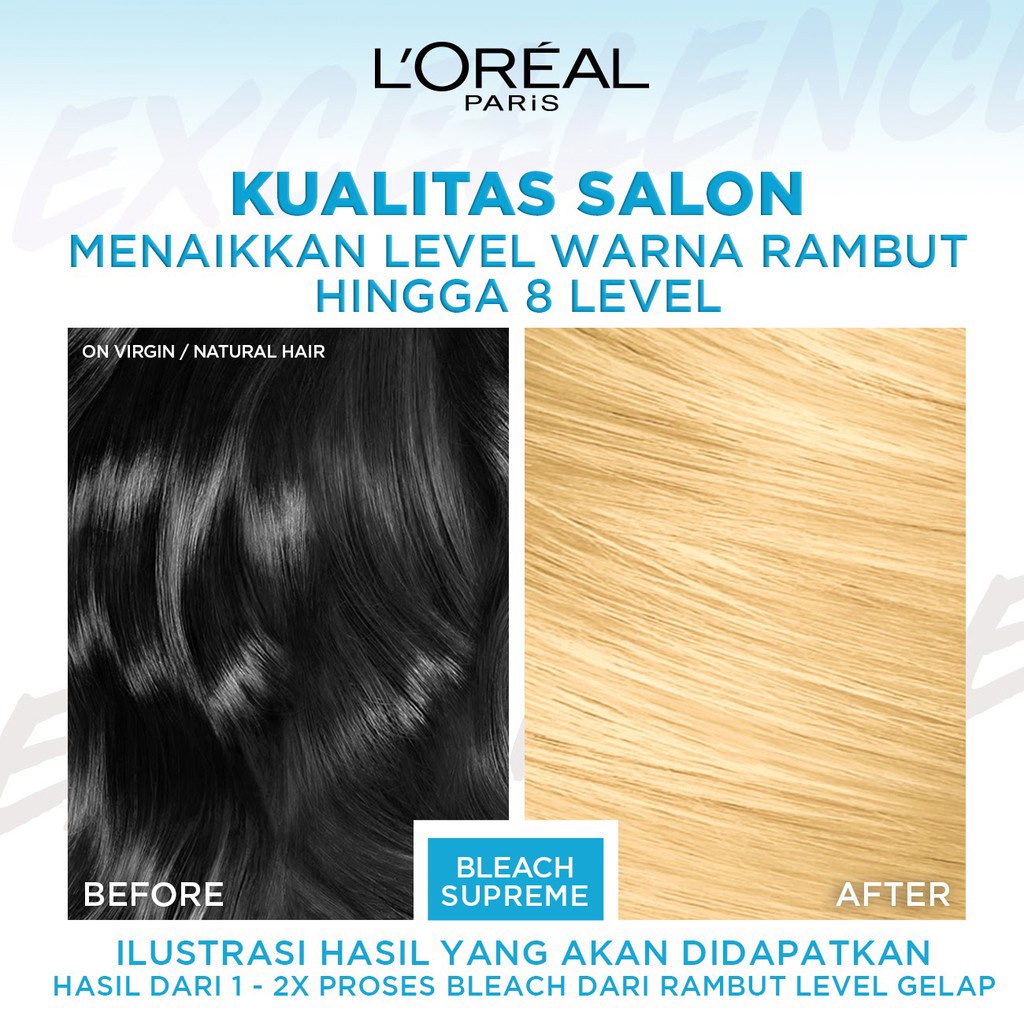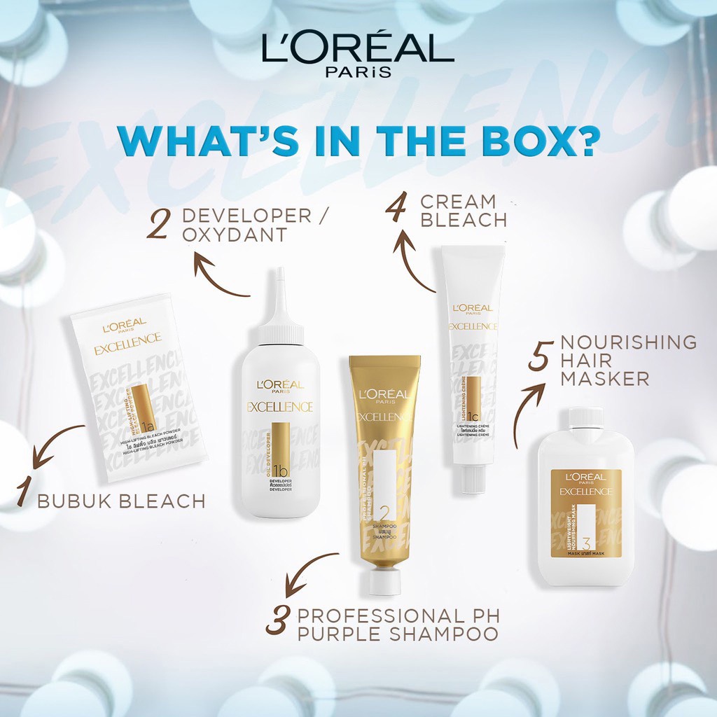 BARU! L'Oreal Paris Excellence Bleach. Bleach dengan Kualitas Salon. Meningkatkan warna rambut hingga Level 8 bahkan di warna dasar rambut gelap. Dilengkapi dengan care technology : Professional Purple PH shampoo (untuk menetralisir warna kekuningan setelah bleaching) dan Lightweight Mask untuk merawat rambut yang sudah di bleach dengan active caring oil.