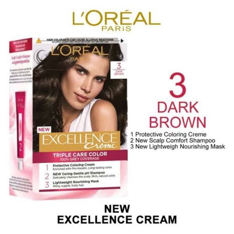 Loreal Paris Excellence Creme Hair Color Pewarna Semir Rambut 3 -Dark Brown EXP 2026 Pewarna rambut yang melindungi rambut sebelum, saat, dan sesudah pewarnaan. Rambut tetap sehat, terasa lembut dan halus. Warna rambut terlihat sensasional dan uban tertutup dengan sempurna! Pewarna rambut dengan Triple-Care Protection, sebuah formula yang diperkaya dengan Ceramide, Pro-Keratin, dan Collagen yang membantu merawat, melindungi, dan menutrisi rambut