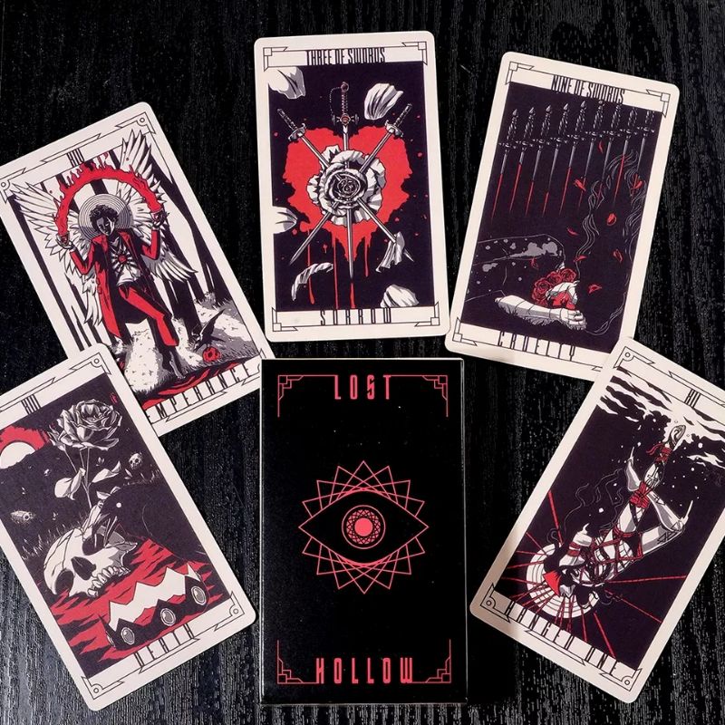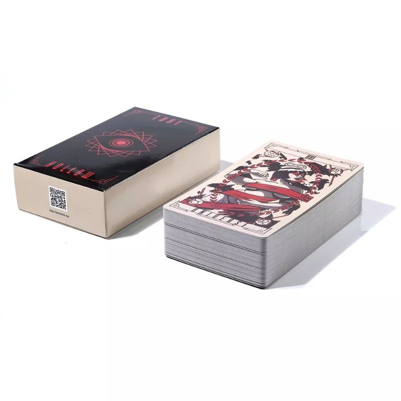 Each card is drawn in a red, black and white color scheme that keeps the whole deck unified in one consistent look and feel. The characters in the deck are a diverse cast that bring to life the varied beauty of the setting and its inhabitants. Every card meaning has a considered mediation between its different sources and as such you will see a melding of traditions.