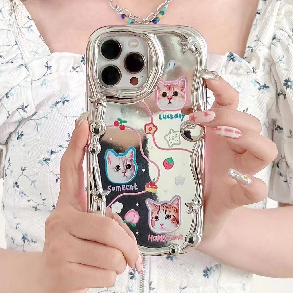 Detail Lovely Kitty Puppy Wave Silver Mirror Soft Case iP iPhone 14 + Plus X XS XR 11 12 13 Pro Max FTD Casing Apple