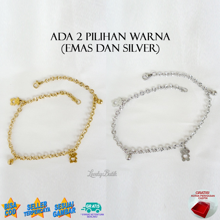 Tampil Cantik dan elegant tidak harus mahal. Kini telah hadir perhiasan titanium pengganti emas putih dan emas kuning. Kami menyediakan Perhiasan yang terbuat dari bahan TITANIUM asli (kualitas import) . Perhiasan Titanium anti luntur, anti alergi, hitam atauberkarat. Kami jamin perhiasan kami tidak akan karatan bila terkena air, sabun , handbody dan parfum. Barang dijamin sesuai dengan gambar karena difoto langsung dari produknya. Gelang KakiTitanium perhiasan kami tidak akan luntur warnanya menjadi hitam atau karatan walaupunterkena air, parfum & zat kimia. Gelang kaki titanium Wanita Khusus untuk warna gold bisa pudar tapi lama tetapi sepudar2nya ke warna silver atau warna asli titanium dan tetap tidak akan hitam ataupun karatan. Gelang kaki dengan modelnya yang exclusive dan sangat cocok sebagai kado ulang tahun dan hadiah untuk orang yang tersayang. Panjang Gelang kaki wanita adalah 27 cm dengan model rantai Nori donat dan ada gantungan bear tanpa krincingan. Tersedia warna Emas dan Silver. Anklet wanita di design dengan model yang simple tapi sangat elegant bagi pemakainya.