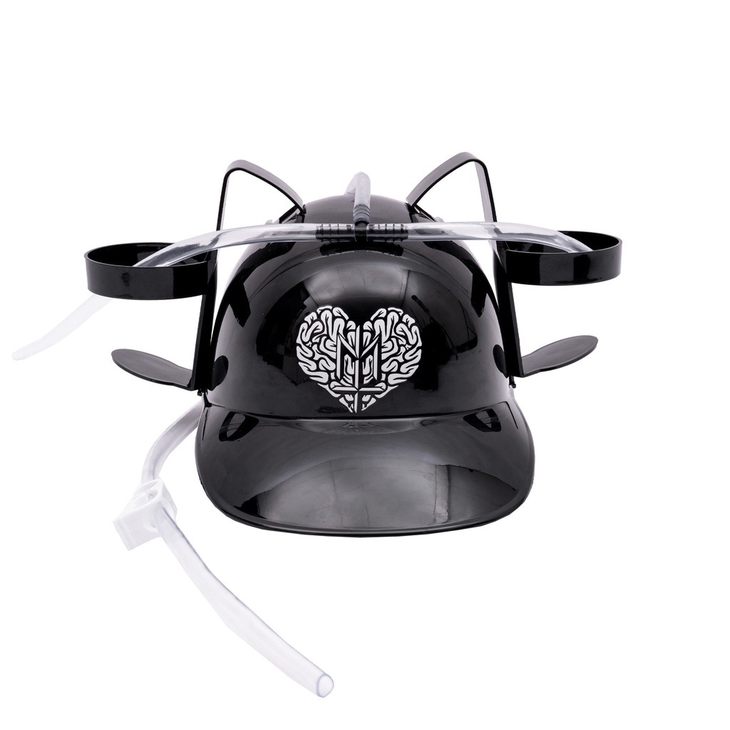 Black plastic drinking helmet, with white ink screenprint at front. Suitable for 46cm – 58 cm (head circumfences)