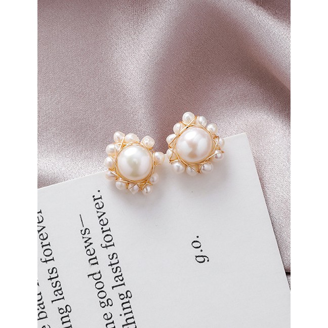 LRC Anting Tusuk Fashion Gold 925 Silver Needle Woven Round Size Pearl Earrings D15277