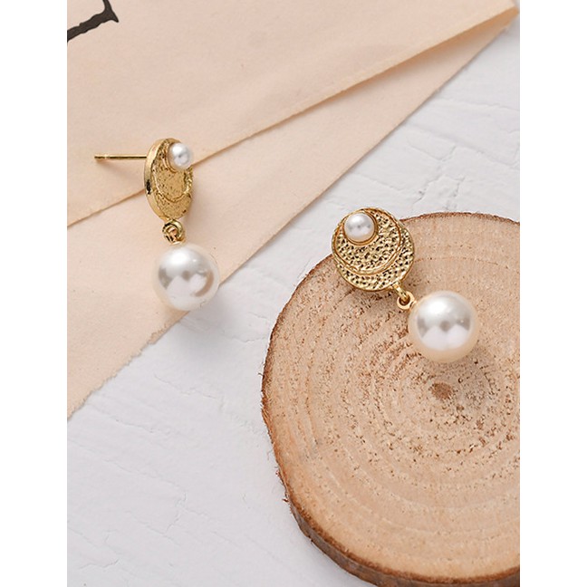 LRC Anting Tusuk Fashion Gold Artificial pearl Geometric Round Metal Stud Earrings D34132