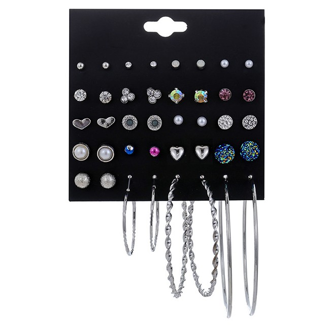 LRC Anting Tusuk Fashion Silver Diamond-stitched Geometric Pearl Earrings Set F71695