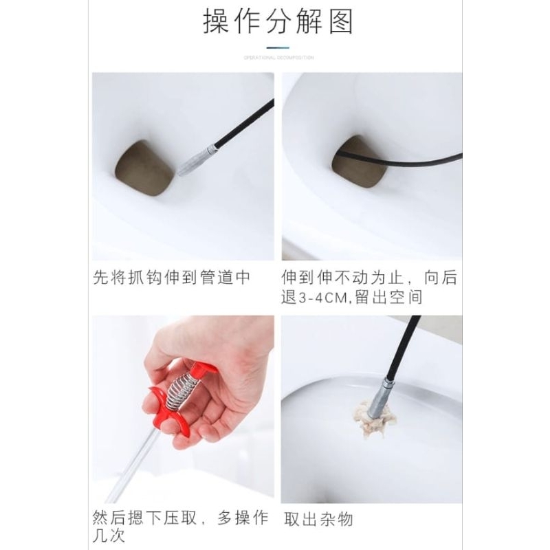 Capitan Pembersih Kotoran Sumbatan Wastafel Cocok untuk membersihkan kotoran yang nyangkut di pipa saluran pembuangan wastafel, tempat cuci tangan, dan sink dapur. Kotoran yang nyangkut seperti rambut dan sisa-sisa makanan bisa dikeluarkan dengan alat ini. Cukup masukkan selang alat ini ke dalam lubang wastafel, kemudian tekan ujung tombol alat ini untuk mengaktifkan capitan yang terdapat diujung bawah. Dengan cara kerja pegas spring mencapit kotoran yang nyangkut pada pipa, tahan tombol yang ditekan agar kotoran tetap tercapit, kemudian tarik alat tersebut sampai kotoran terangkat keluar. Ulangi beberapa kali sampai semua kotoran yang nyangkut terambil semua.