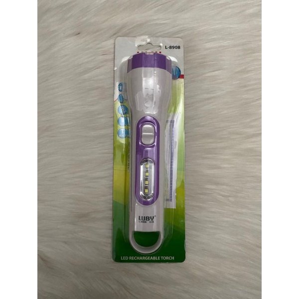 Senter Luby tipe L-8908. Memiliki keunggulan baterai isi ulang yang berkapasitas 500mAh, mudah perawatannya, dan tahan lama. Menggunakan SMD LED import yang ramah lingkungan, serta cahaya putih yang sangat terang, mengkonsumsi daya 1 watt. Dengan 1 LED yang dapat bekerja hingga 10 jam.