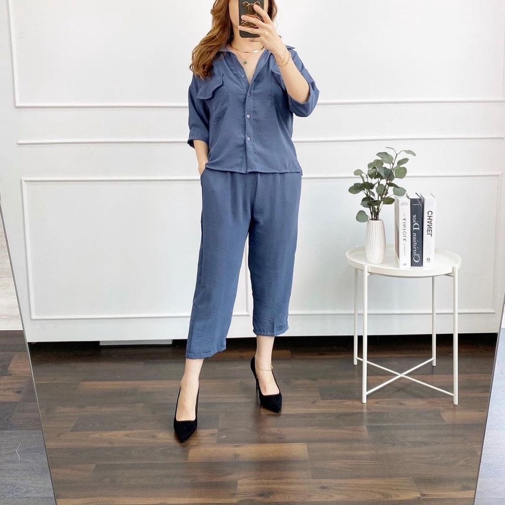 Fashion Muslim > Set > Lucia Set Setelan Celana + Atasan Wanita Lengan Pendek Bahan Crinkle Premium Import Polos Kekinian / Stelan Remaja Muslim Busui Jumbo Viral Outfit OOTD Korean Style Terbaru / Baju Tidur Piyama Set Jumbo Wanita Termurah