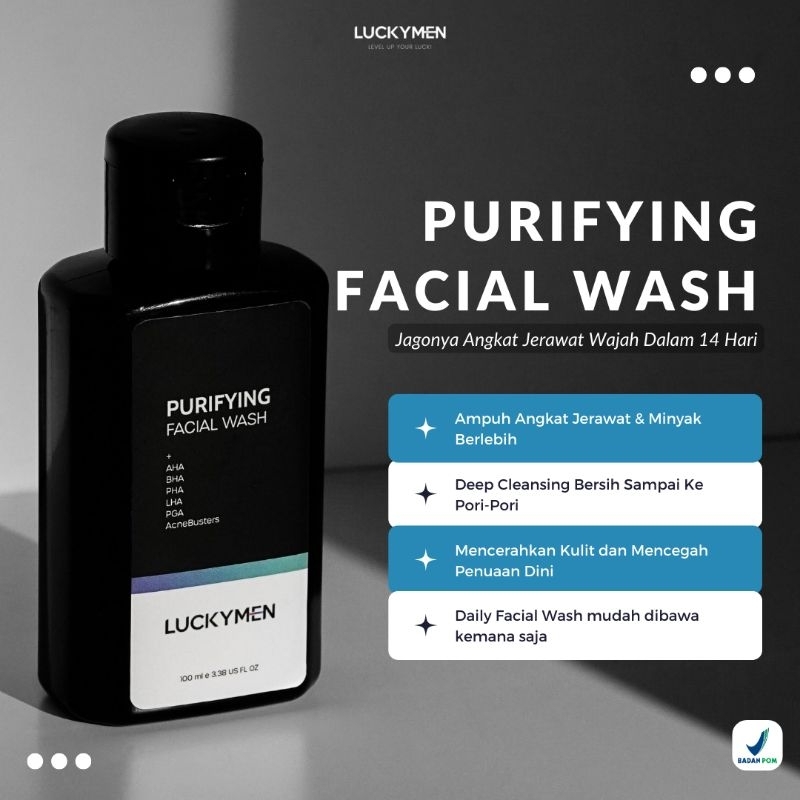 LuckyMen Purifying Facial Wash merupakan pembersih wajah yang memiliki kandungan Acne Busters seperti Glycine Soja (Soybean) Seed Extract, Salix Alba (Willow) Bark Extract, dan juga Houttuynia Cordata Extract yang ampuh untuk mengatasi serta mencegah jerawat, selain itu mengandung juga AHA, BHA, PHA, LHA, dan PGA yang berfungsi untuk eksfoliasi secara halus.