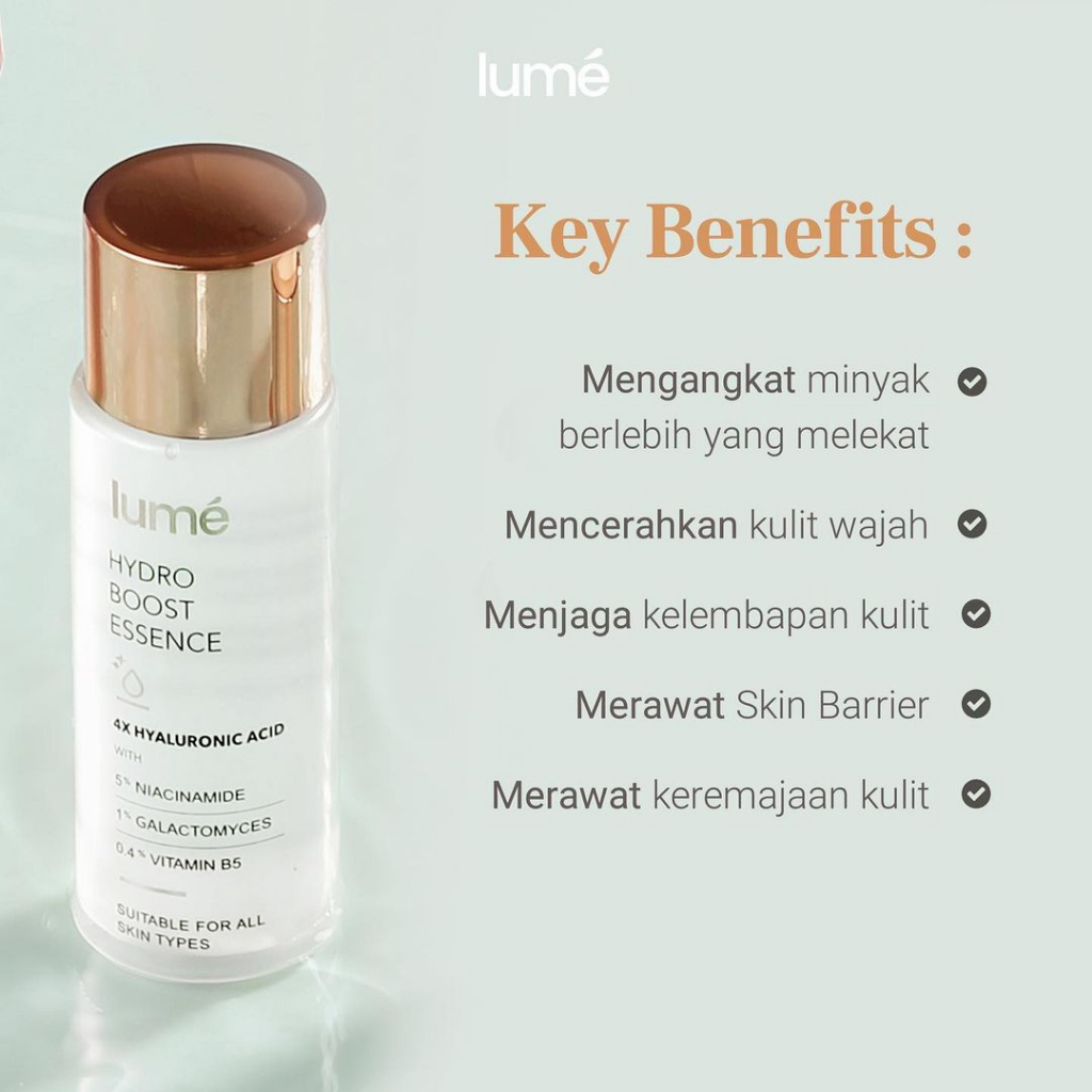 LUME Hydro Boost Essence Tersedia dalam 2 ukuran ✨Ukuran 80 mL ( Regular Size ) ✨Ukuran 33.5 mL ( Travel Size ) Diformulasikan khusus dengan gabungan 4 jenis Hyaluronic Acid, Galactomyces dan Phytexcell Centella yang ditargetkan untuk menghidrasi semua lapisan kulit hingga bagian terdalam.