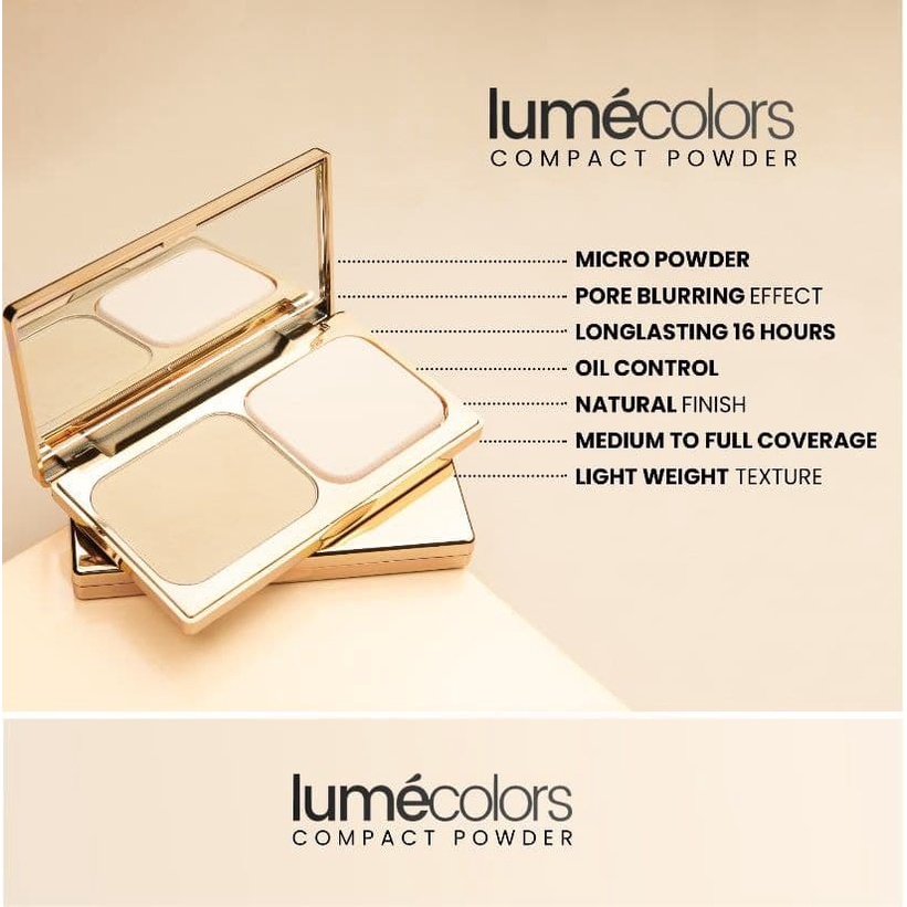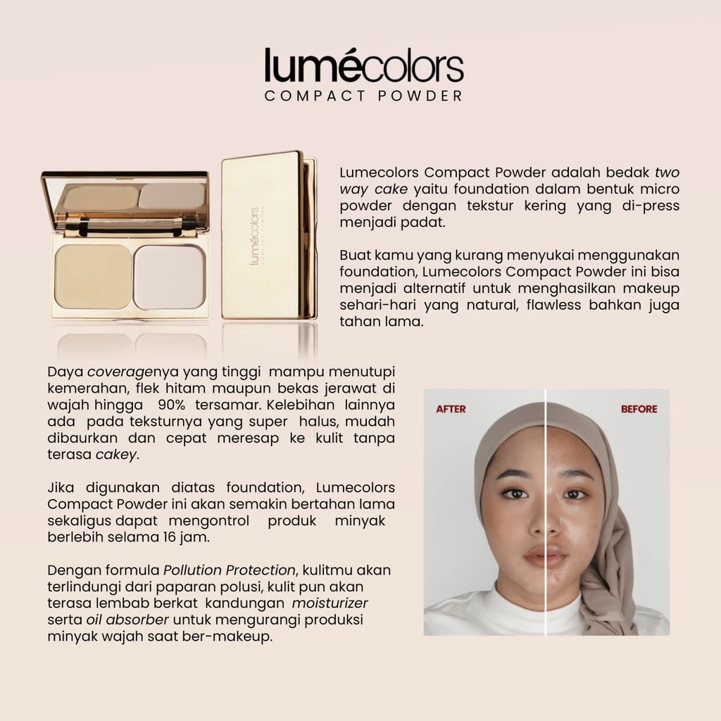 Rasakan 7 manfaat bedak padat dari Lumecolors Compact Powder: ✓ Lasting Up to 16 Hours ✓ Pressed Micro Foundation Powder ✓ Pore Blurring Effect ✓ Oil Control ✓ Natural Finish ✓ Medium to Full Coverage ✓ Lightweight Texture