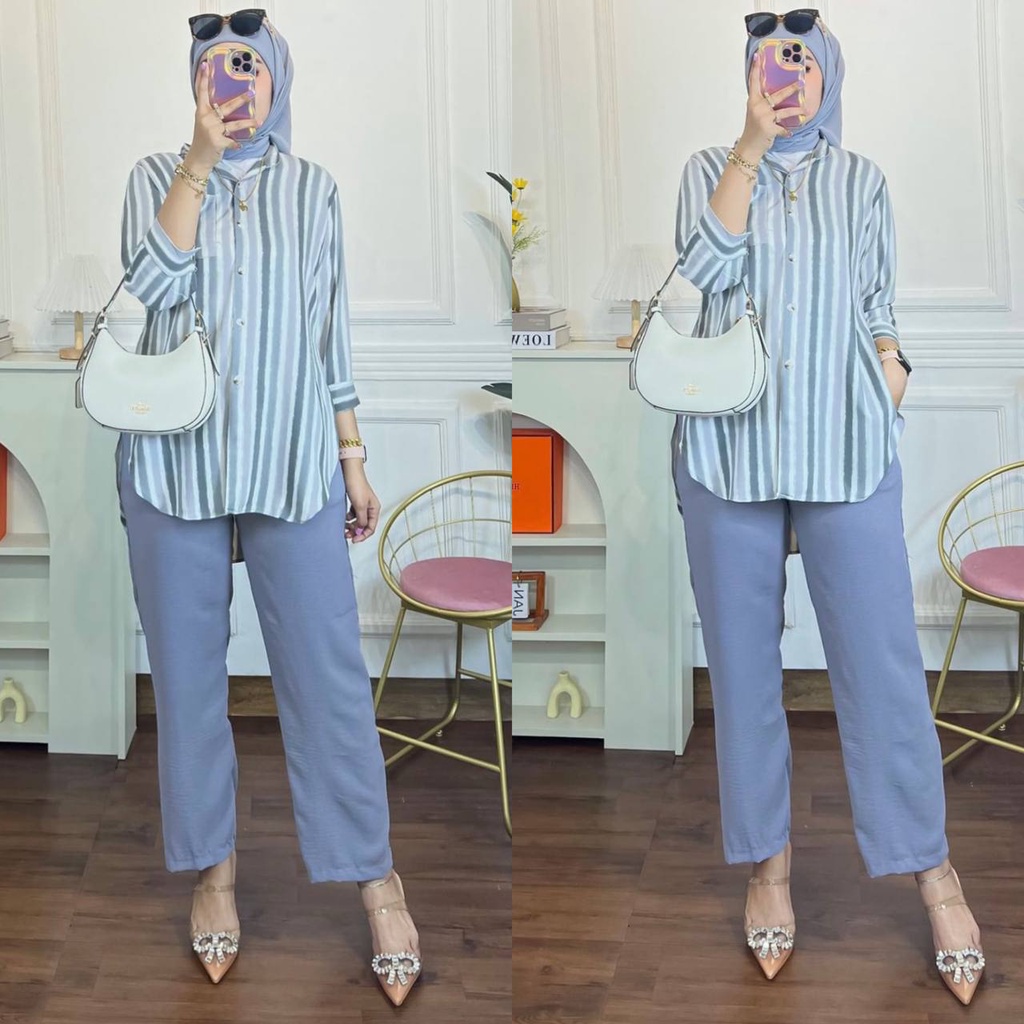 Luna Set - One Set Wanita Kemeja Salur Shakila Twill Premium Setelan Baju Lengan 7/8 Set Celana Panjang Kekinian LD 110 cm PRODUCT DETAILS :