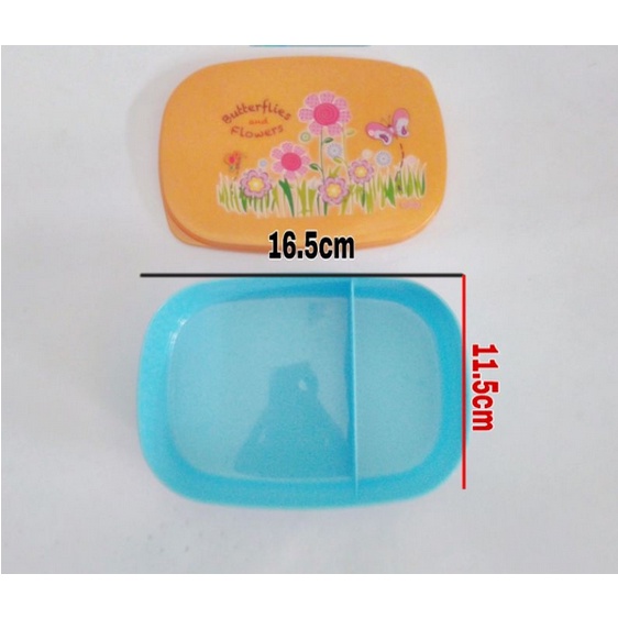 Bahan : Plastik Food grade aman untuk tempat makanan sehari-hari Warna tutup dengan wadah random dari pabrik Motif dan warna random tidak bisa request warna Terdapat sekat 2 untuk memisahkan nasi dengan lauk