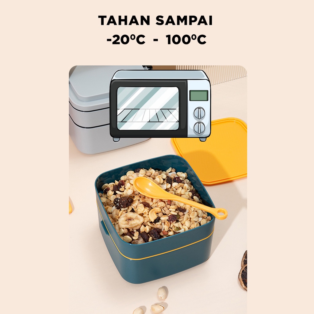Kotak makan siang 2 lapis dengan bahan PP + silicone yang kuat sehingga membuat kualitas tas bekal menjadi lebih awet. Terdapat 2 lapis pada kotak makan, sehingga peletakkan makanan dapat dipisah.