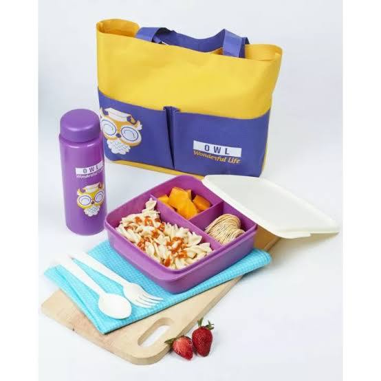 Paket berisi 1 Tas, 1 Botol Minum, 1 Lunchbox, 1 sendok & Garpu.