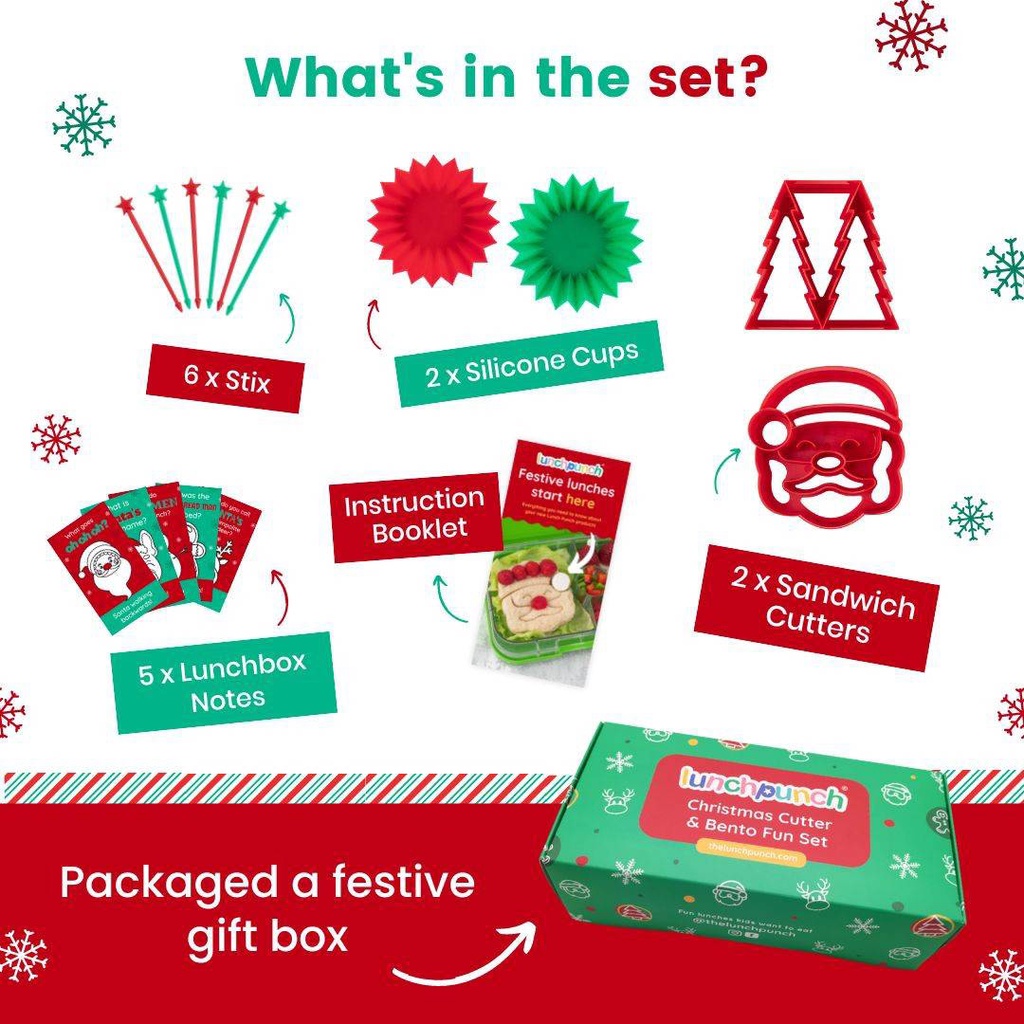 Christmas Series 1 x Santa Sandwich Cutter 1 x Trio Christmas Tree Sandwich Cutter 6 x Red & Green Stix 1 x Red Jumbo Silicone Cup 1 x Green Jumbo Silicone Cup 5 x Full Colour Lunchbox Notes with themed jokes 8 Page DL Full Colour Instructional Booklet with festive tips & recipes