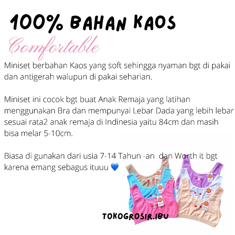 Hi moms, miniset ini cocok bgt di gunain untuk anak gadis mommy yang berinjak remaja dan latihan memggunakan BRA ya moms, Bahanya dari Kaos jadi pas dipakai ga bikin kegerahan dan nyaman.