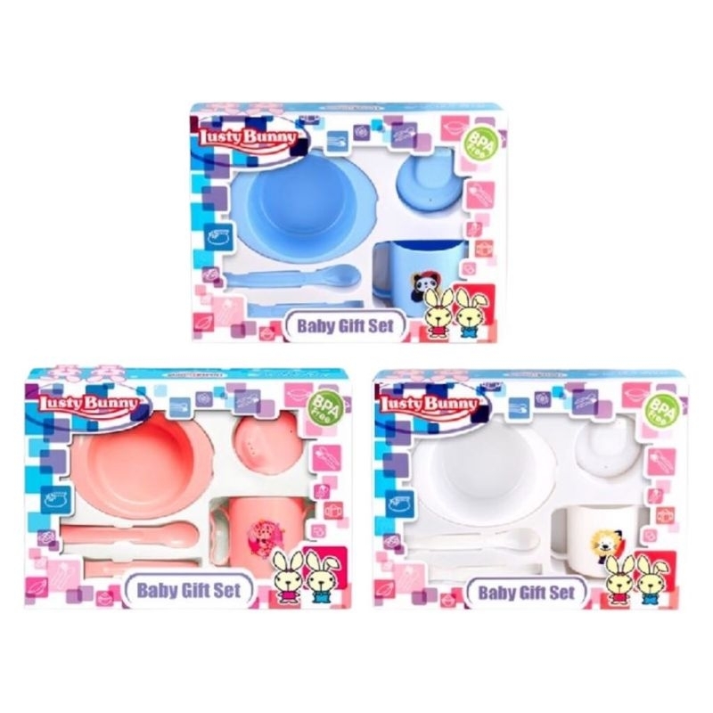 Feeding set Lusty Bunny adalah hadiah/kado yang cocok untuk para orang tua yang merayakan hari-hari spesial buah hatinya; seperti kelahiran dan hari ulang tahun. Perlengkapan makan LustyBunny dibuat dari bahan plastic food grade Polupropylene [PP] yang aman untuk bayi anda. Kemasan box feeding set kami dirancang dengan presentasi yang menarik. Feeding set LustyBunny tersedia dalam beberapa ukuran. 1 Box terdiri dari: - SENDOK - GARPU - MANGKOK - GELAS - TUTUP GELAS