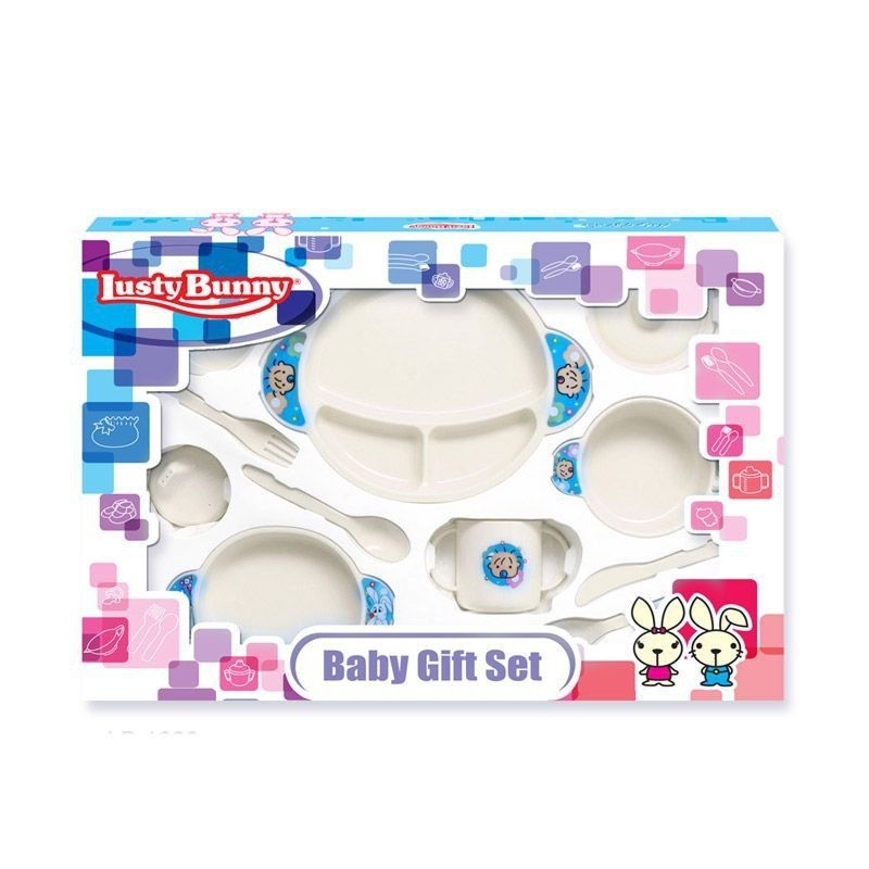 Terdiri dari piring besar, piring kecil, mangkuk + tutup mangkuk, mangkuk kecil, cangkir + tutup cangkir, pisau, sendok panjang, dan sendok + garpu kecil Memudahkan ibu menyajikan kebutuhan bayi Terbuat dari bahan yang aman dan tahan lama packaging menggunakan box