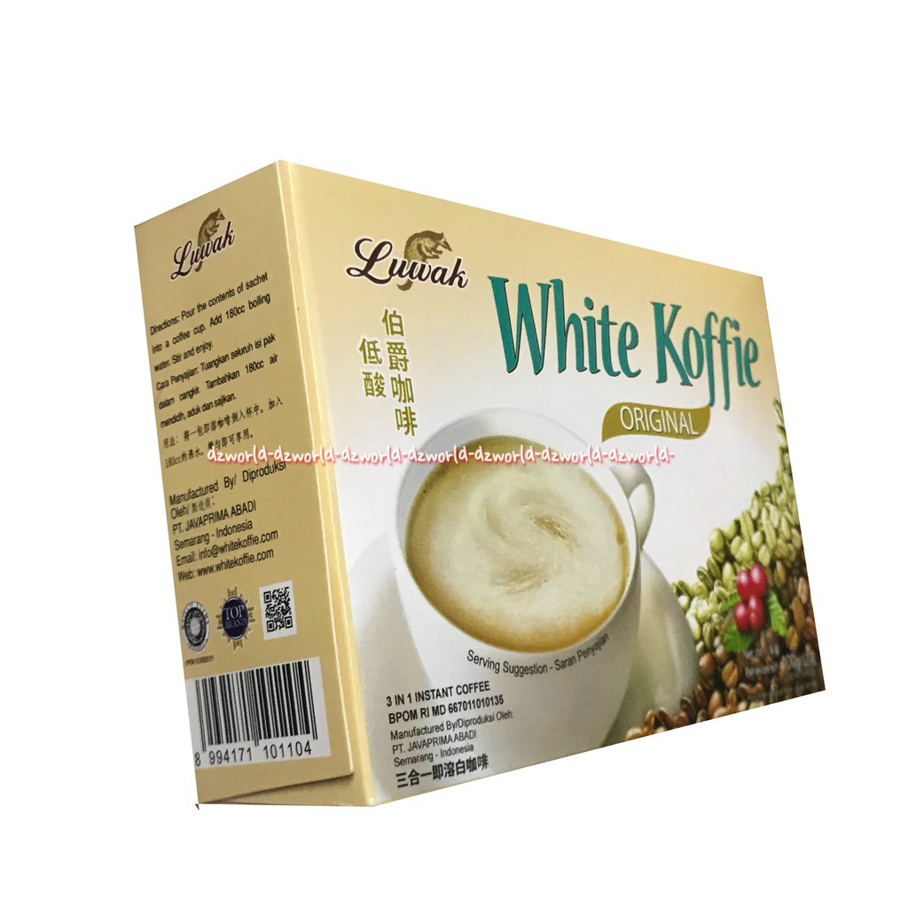> Kegunaan Umum : * LUWAK WHITE KOFFIE adalah kopi instan 3 in 1 rasa penuh yg di netralkan asam (LOW ACID). * LUWAK WHITE KOFFIE menghindari dari penyakit maag & gangguan pencernaan. * LUWAK WHITE KOFFIE diproduksi oleh teknologi Cold / Freeze Drying dari Jepang, melalui proses pembekuan s/d -40 derajat celcius, mampu menghilangkan asam lambung (sebabkan rasa sakit di perut) hingga 80%. * Kafein dlm LUWAK WHITE KOFFIE Masih bisa dipertahankan hingga 100% dgn paduan kopi larut dgn High Quality Non-Dairy Creamer & Sugar dlm mesin pencampur standar tinggi utk ciptakan campuran sempurna. Kemudian, coffee maker dicampur menjadi conveyor otomatis utk proses pengemasan.