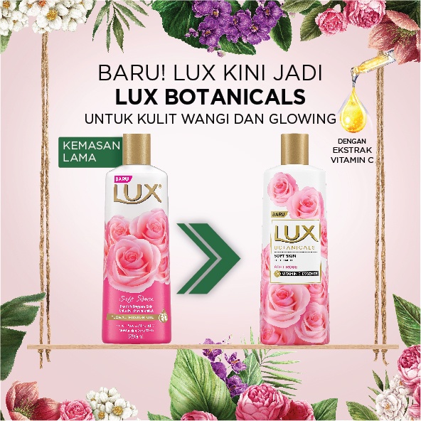 •Lux Sabun Mandi Cair •Efektif sebagai sabun cuci tangan •Lux Botanicals Soft Rose dengan Vitamin C Essence dan Floral Beauty Oil •menghadirkan pengalaman mandi yang memanjakan kulit dan dirimu •Diperkaya dengan Vitamin C Essence dan ekstrak bunga Mawar Perancis •adir dalam formulasi yang dapat melembapkan dan melembutkan kulitmu dengan keharuman alami •Tanggal yang Tertera di Kemasan adalah Tanggal Produksi, Bukan Tanggal Expired