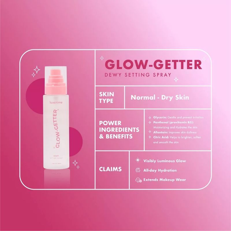Lavandula Angustifolia (Lavender) Water: - Calming and Anti-bacterial - Soothing - Helps relieves irritated and sensitive skin - Promotes scars healing Luxcrime Stay Last Setting Spray memiliki fitur partikel mikro dengan jumlah pelepasan dari penyemprot sangat kecil dan halus yang tidak akan meninggalkan noda di wajah anda