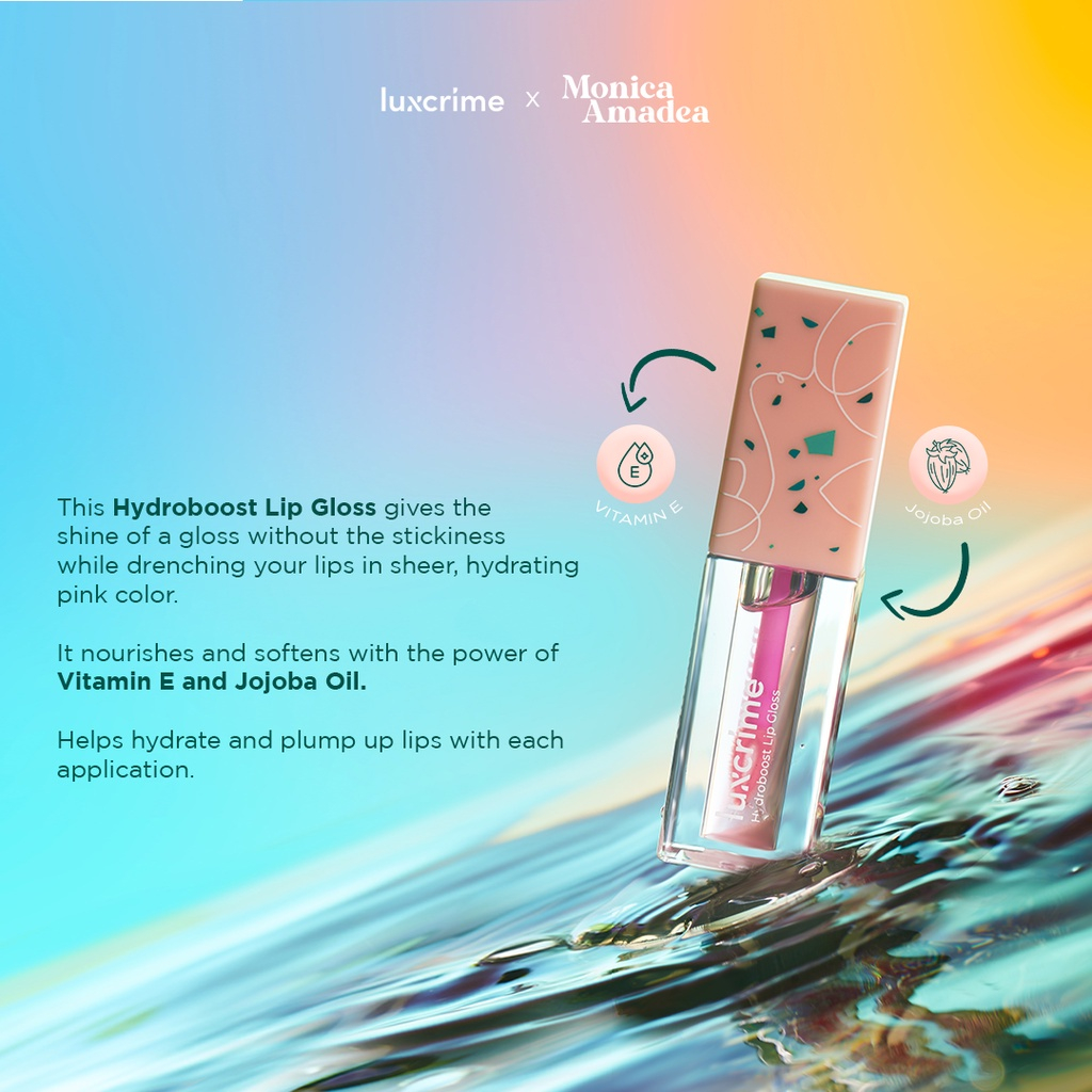 •Luxcrime Hydroboost Lip Gloss Lips look fuller and plumper after applying this high-shine Lip Gloss. This Hydroboost Lip Gloss gives the shine of a gloss without the stickiness while drenching your lips in sheer, hydrating pink color. It nourishes and softens with the power of Vitamin E and Jojoba Oil. Helps hydrate and plump up lips with each application.