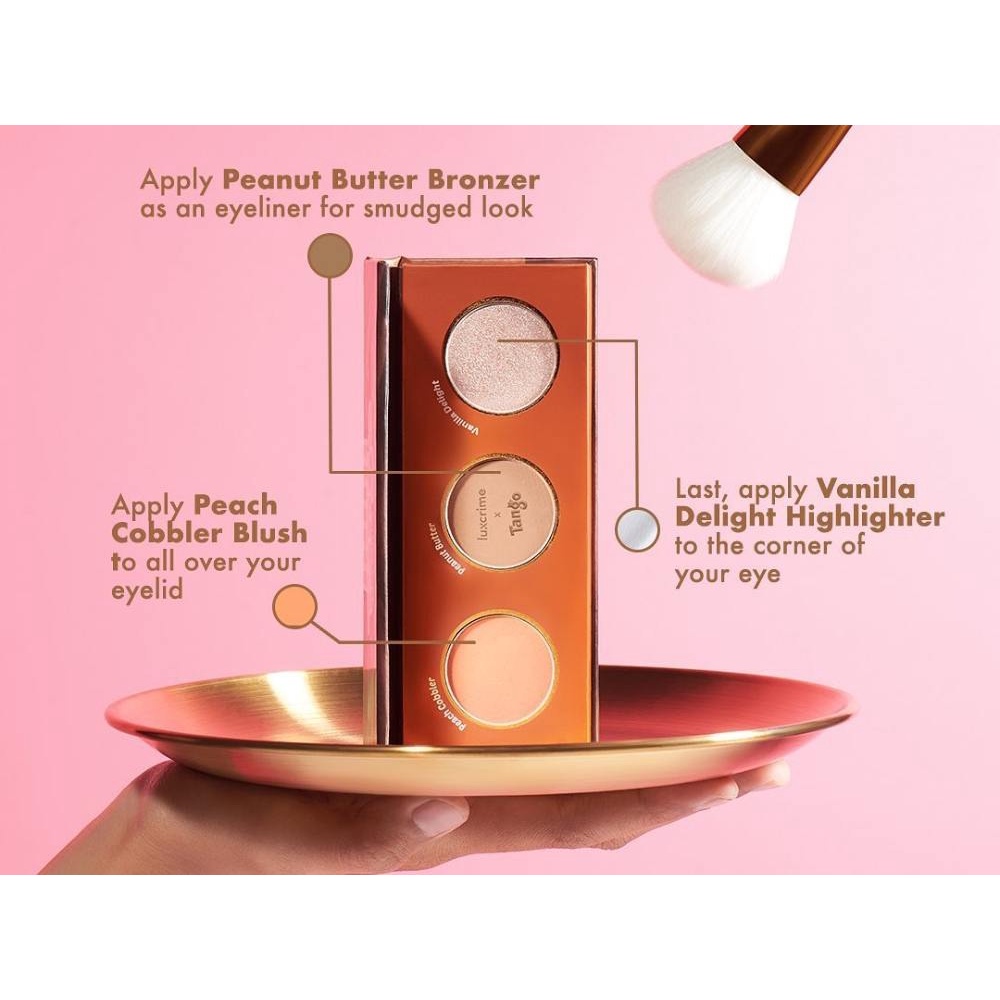 Shade Description: Peach Cobbler: Peachy blush Peanut Butter: Light brown bronzer Vanilla Delight: White pearlized highlighter #tango #luxcrime
