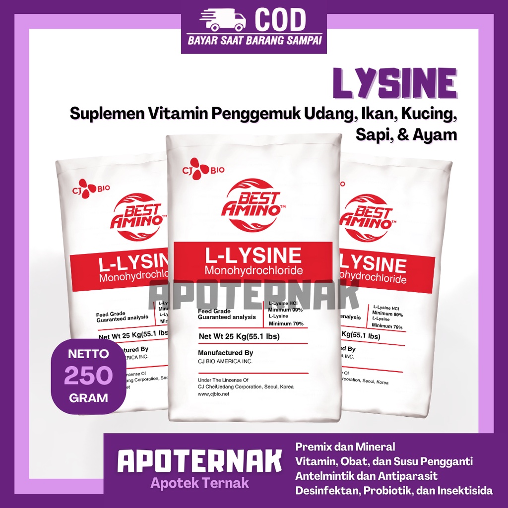 INDIKASI: LYSINE menyuplai asam amino esensial LYSINE memproduksi kalogen LYSINE meningkatkan kekebalan tubuh LYSINE menghangatkan tubuh LYSINE mempercepat penambahan bobot LYSINE bersama dengan vit.C membentuk L-carnitine LYSINE meningkatkan tingkat susunan lemak halus LYSINE membantu penyerapan kalsium pada tubuh ayam.