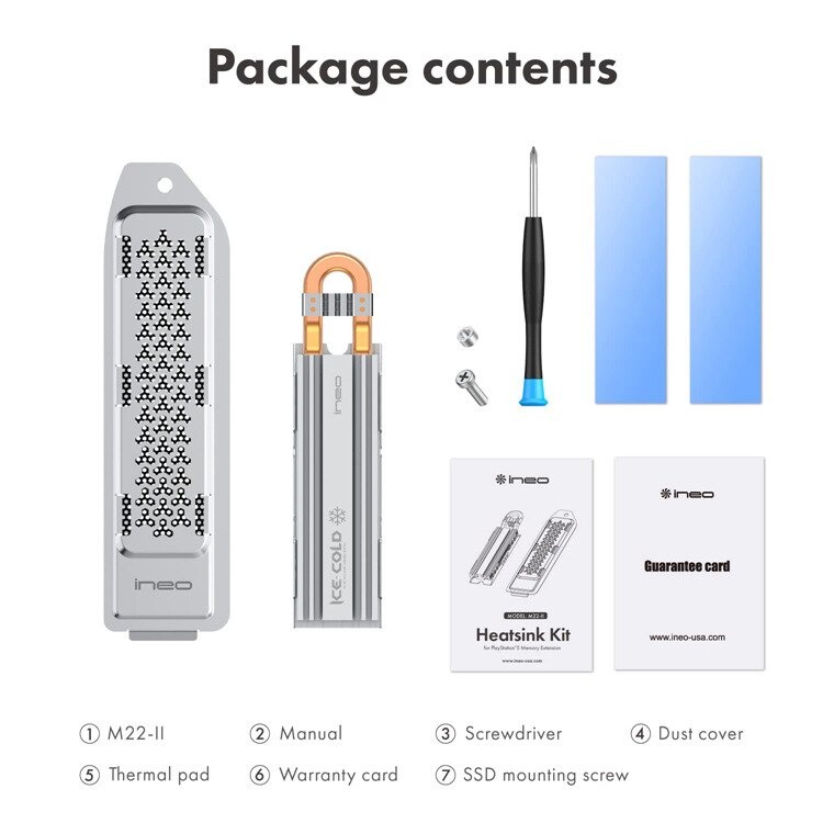 Feature: Double-sided silicone sheet, efficient heat dissipation. The structure is equipped with two thermally conductive silicone sheets, which quickly dissipate the heat of the hard disk through the metal body. Pure copper heat pipe, strong heat dissipation. The heat generated by the SSD will be absorbed by the heat pipe, and the copper pipe will dissipate heat, making it more powerful. Double-row copper tubes with high thermal conductivity can achieve rapid cooling effect. Solid magnesium aluminum alloy for heat dissipation. The high performance comes from the numerous heatsinks and clever use of the air circulation drawn by the for PS5's main cooling fan. The streamlined profile closely fits the inner frame of the for PS5 case, providing a stable and effective cooling solution for the PS5. This cooler is available for PS5 Ultra HD and Digital editions. On the hardware side, it is compatible with any standard NVMe M.2 SSD. Thoroughly tested with most PCIe 4.0 SSDs. It supports 2230, 2242, 2260, 2280 form factors and will also work with the 22110 in the future.