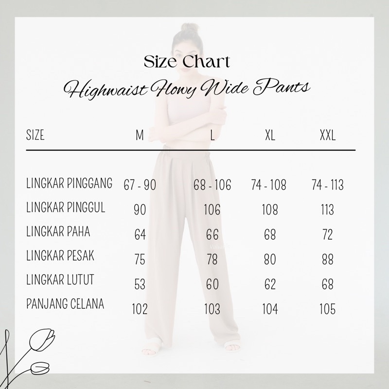 Highwaist Basic Flowy Wide Pants Material : Cotton crinkle airflow ( karakteristik : tekstur berkerut lembut, serat rapat, menyerap keringat, ringan, jatuh , tidak tebal tetapi tidak menerawang saat dipakai)