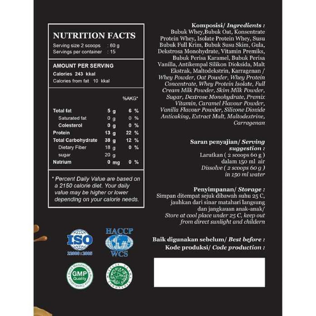 Merupakan pilihan tepat sebagai alternatif serious mass, super mass, dan carnivor mass (memiliki kandungan kalori,protein,creatine lebih tinggi) gluten free, suit for vegetarian!