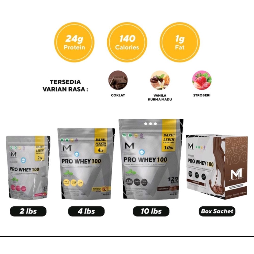 Muscle First Pro Whey 100 2 lbs 900 gr 24g PROTEIN | 130 CALORIES Rasa | No. POM: COKELAT | 662331394367 VANILLA KURMA MADU | 662331411367 STRAWBERRY