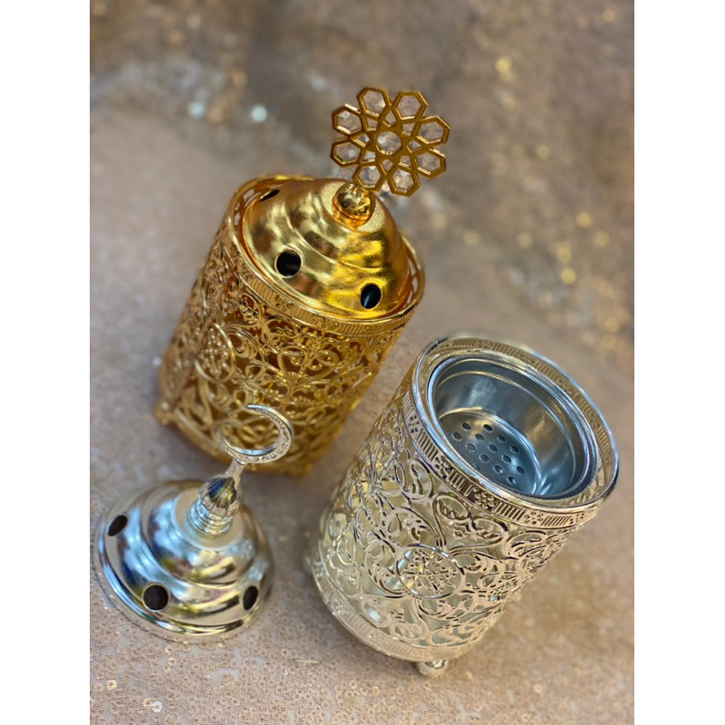 Mabkhara Arab Bulat Bahan Logam Warna Emas ini adalah tempat bakar Dupa untuk kemenyan, dupa lingkar mini, hio mini, atau sejenisnya. Nanti asap akan keluar dari celah-celah tutupnya. Terbuat dari logam warna emas. Karena volume tipe ini cukup besar, jika Anda ingin mengkreasikan jadi tempat minyak pelita juga bisa.