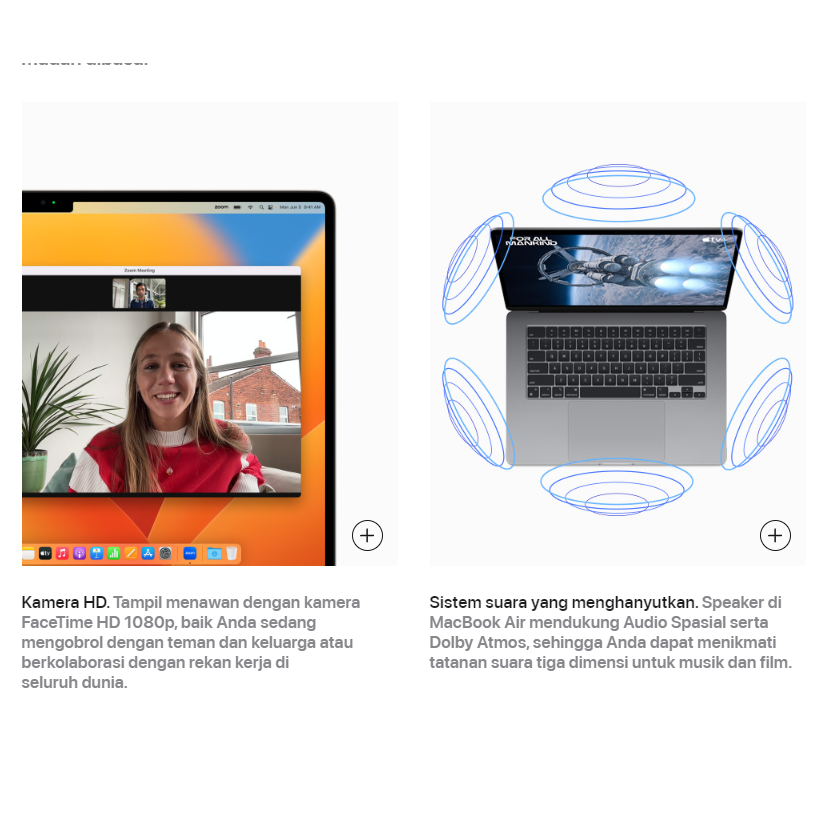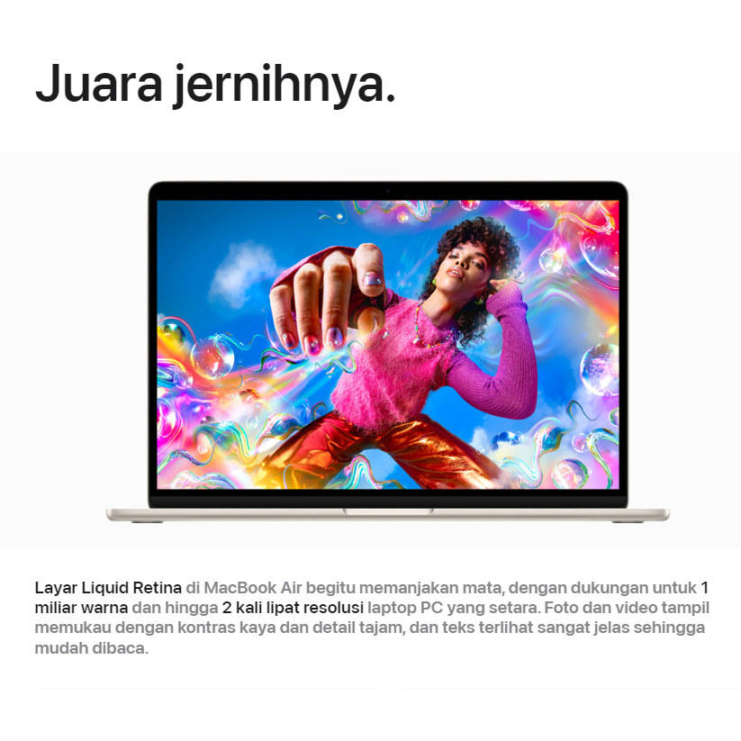 Spesifikasi : 8-Core CPU 10-Core GPU 8GB Unified Memory 256GB / 512GB SSD Storage 16-core Neural Engine 15.3-inch Liquid Retina display with True ToneΒ³ 1080p FaceTime HD camera MagSafe 3 charging port Two Thunderbolt / USB 4 ports Magic Keyboard with Touch ID Force Touch trackpad 35W Dual USB-C Port Compact Power Adapter
