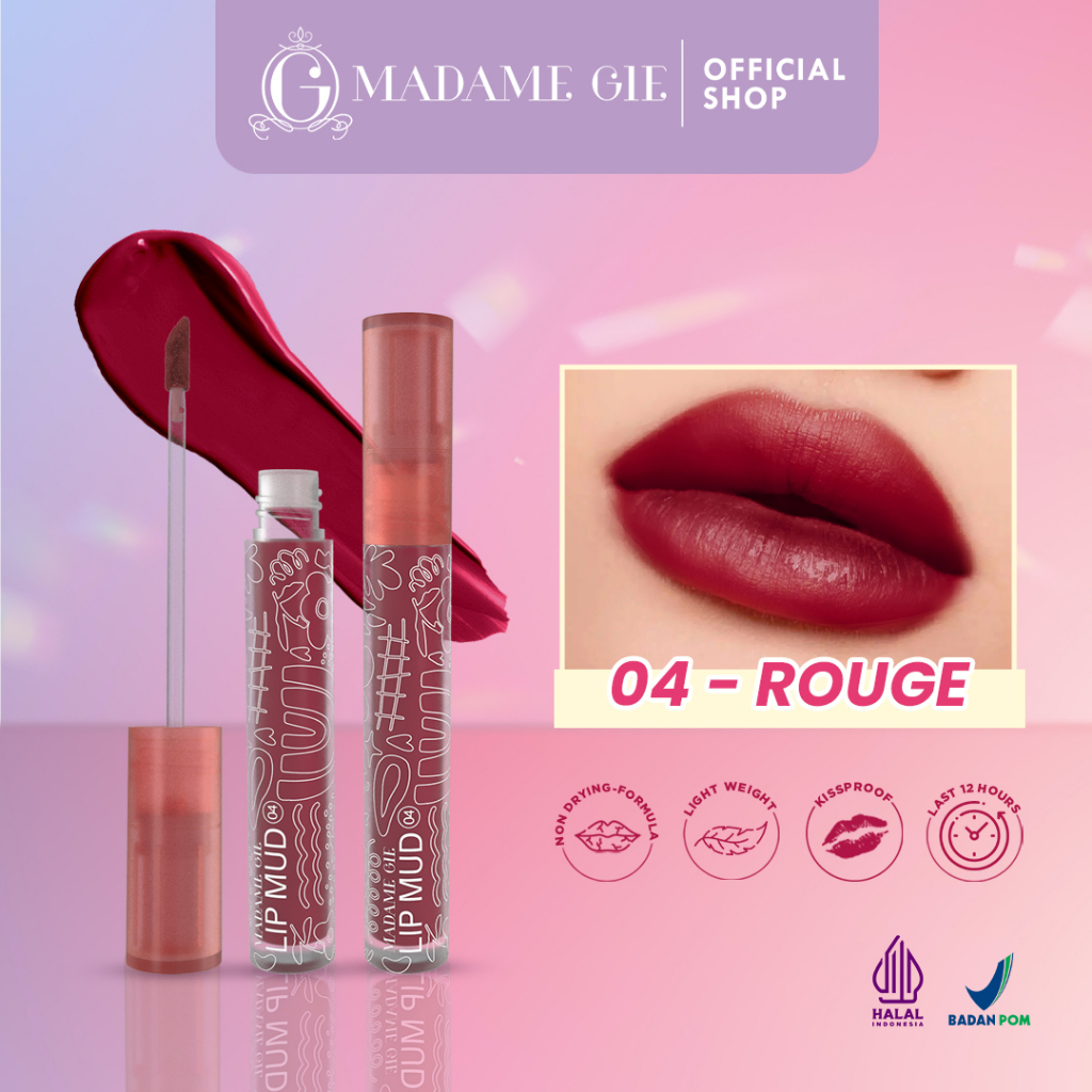 Madame Gie Lip Mud - Lipcream yang memiliki hasil akhir velvet dengan tekstur creamy, super lembut dan ringan saat dipakai. Tahan lama hingga 12 jam, transferproof dan tidak akan memberikan efek patchy atau kering pada bibir, menjaga kelembaban bibir dan memberikan efek halus pada bibir karena mengandung Allantoin. Madame Gie Lip Mud adalah pilihan yang tepat untuk make up lover karena formulanya yang super ringan dan lembut seperti tidak menggunakan lip produk pada bibir.